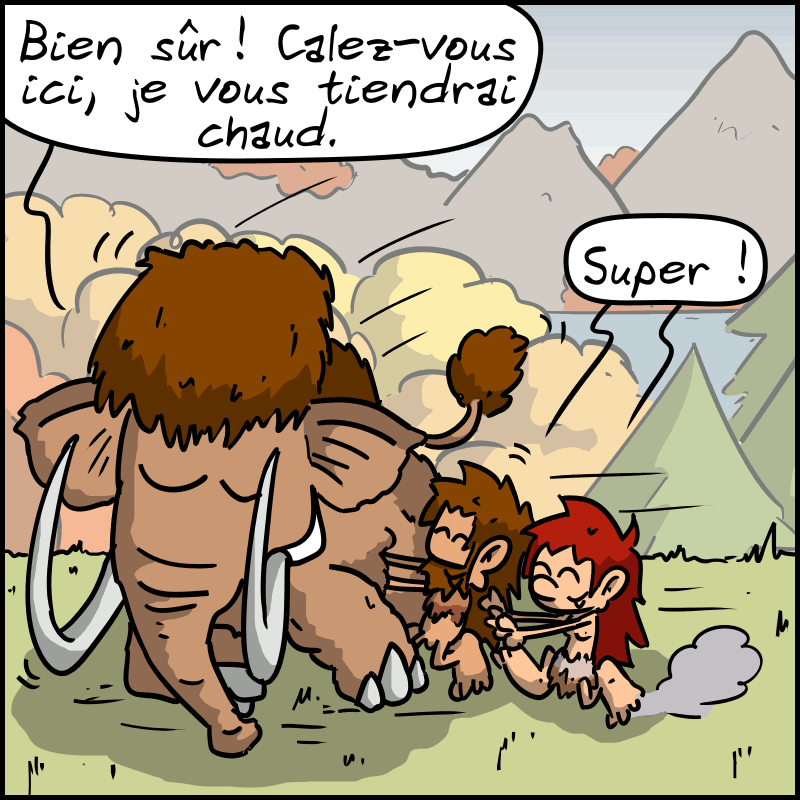 Le mammouth dit : « Bien sûr ! Calez-vous ici, je vous tiendrai chaud. » Les deux autres viennent se coller au mammouth en criant : « Super ! »